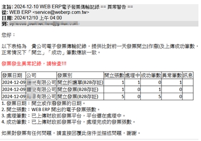 - WEB ERP每日會寄送發票傳輸記錄通知至該設定的電子發票email,請查看是否設定完成