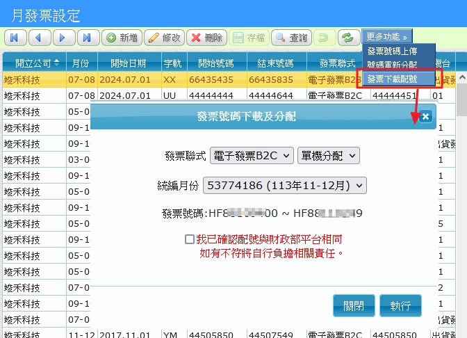 - 每期發票字軌號碼設定,請務必使用「發票下載配號」(如下圖),或者使用電子發票下載「01.電子發票取號(平台)」設定發票字軌號碼,以避免設定錯誤。