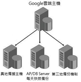 對於資料安全的重視,我們做了三重的備份機制,資料庫即時同步於異地主機達到異地備援,每天進行主機的快照全備份於Google儲存設備,最後在每天凌晨系統及資料庫完全備份回傳回傳到第三地備份設備,達到資料萬無一失的地步,讓租賃客戶能安心將資料託付我們管理。