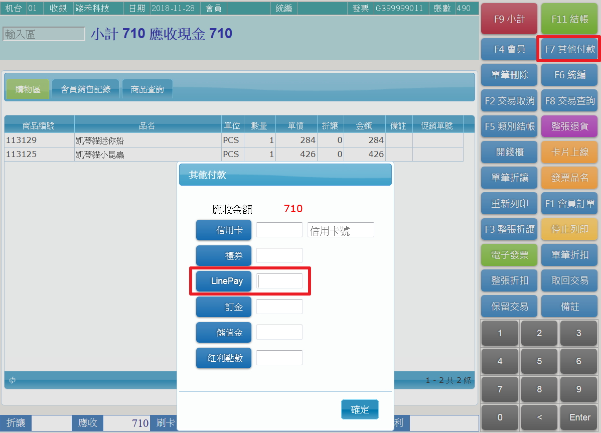 步驟一:POS收銀時選擇其他付款,並選擇 LinePay 付款 步驟二:消費者出示LinePay條碼,LinePay框掃入消費者的LINEPay條碼完成結帳,同時消費者也會收到LINEPay之消費金額通知。