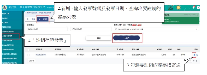 營業人功能選單>存證發票註銷作業>註銷存證發票