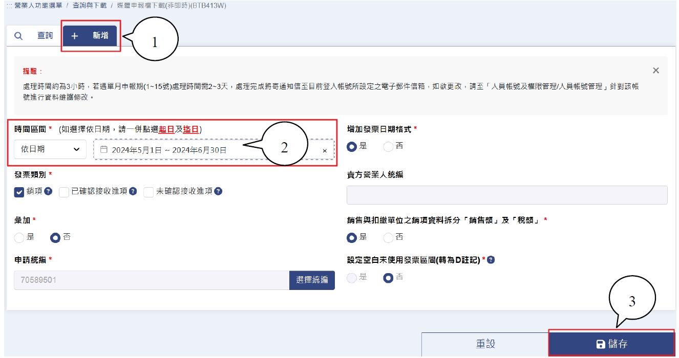 平台>營業人功能選單>查詢與下載> 媒體申報檔下載(非即時) 1.新增 2.選擇期別(可依日期區分)