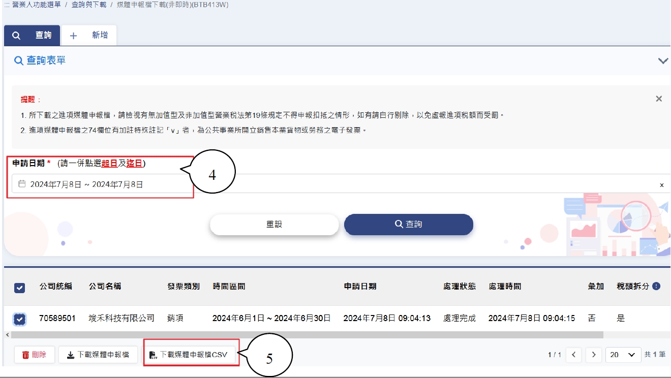 3.在查詢頁面,輸入申請日期查詢 4.選擇下載媒申檔CSV