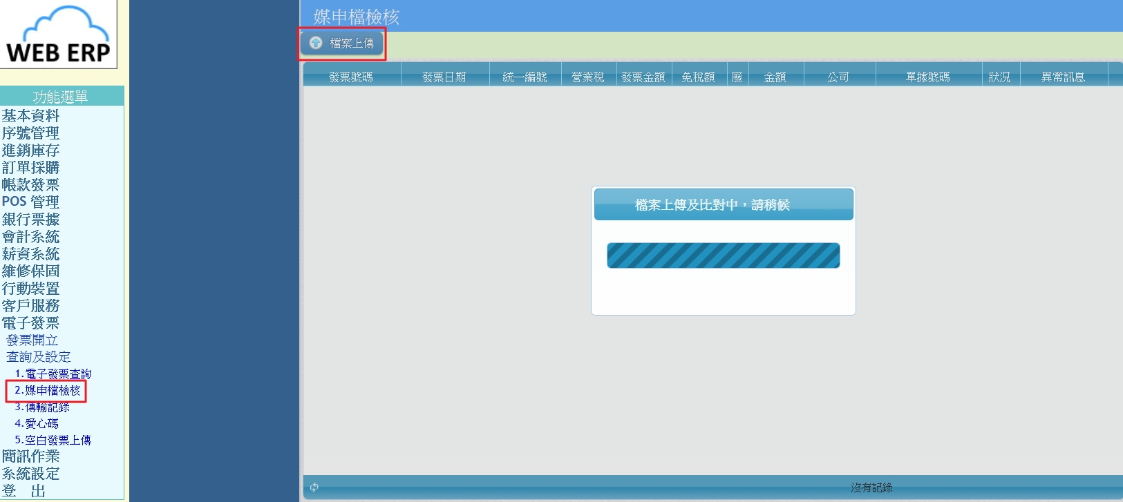 2.上傳到ERP「媒申檔檢核」進行比對,顯示「沒有記錄」即代表發票沒有異常。
