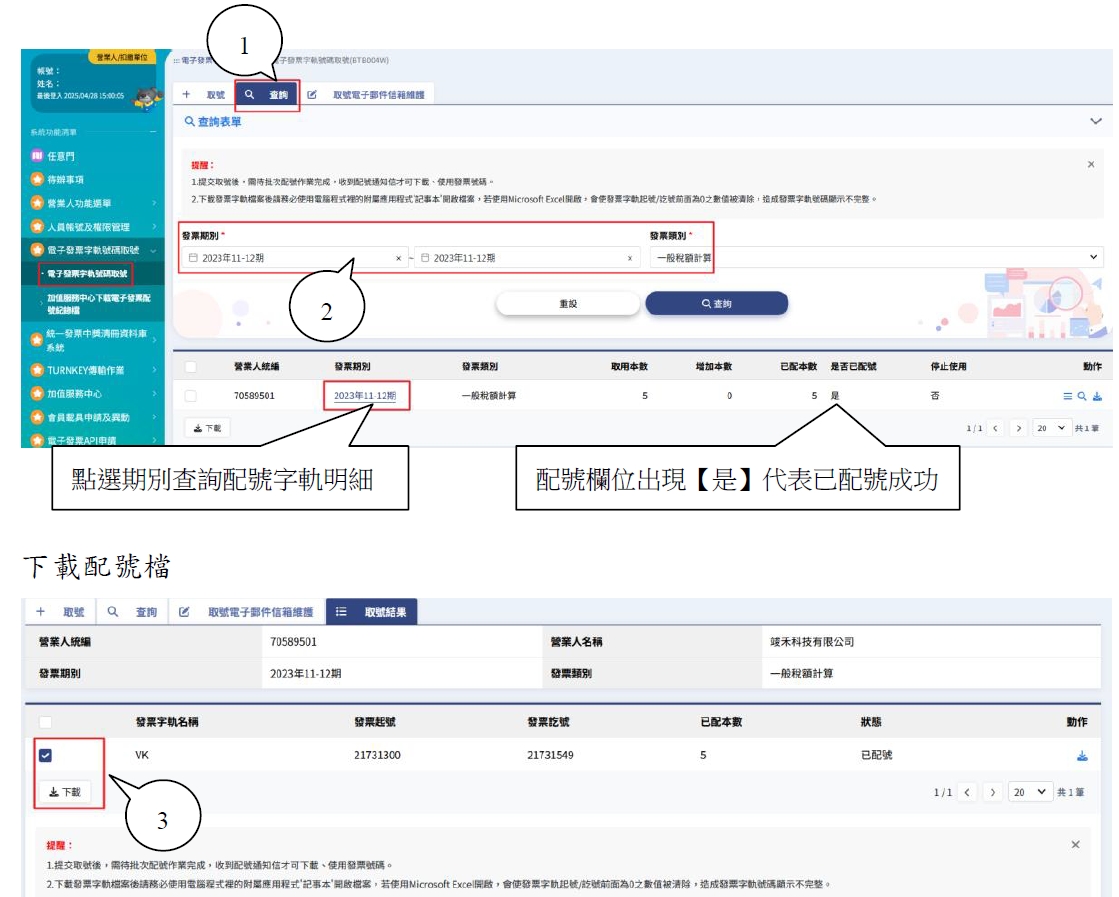 當平台取號或配號後,可以透過查詢來確認發票是否配號成功,並將新發票號碼登錄到ERP系統。