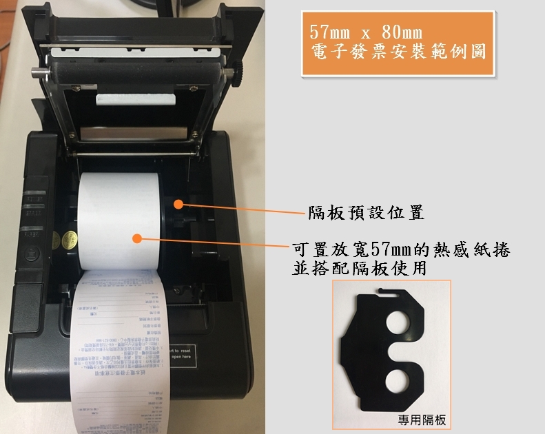電子發票及一般收據出單紙皆可適用 可選擇 80mm / 57mm 紙寬使用,並提供專用隔板