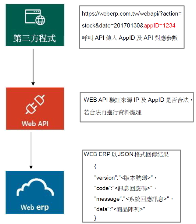 竣禾科技提供第三方程式存取之應用程式,以下稱「WEB API」皆以HTTPS URL 機制提供開發者使用,WEB API呼叫流程如下: