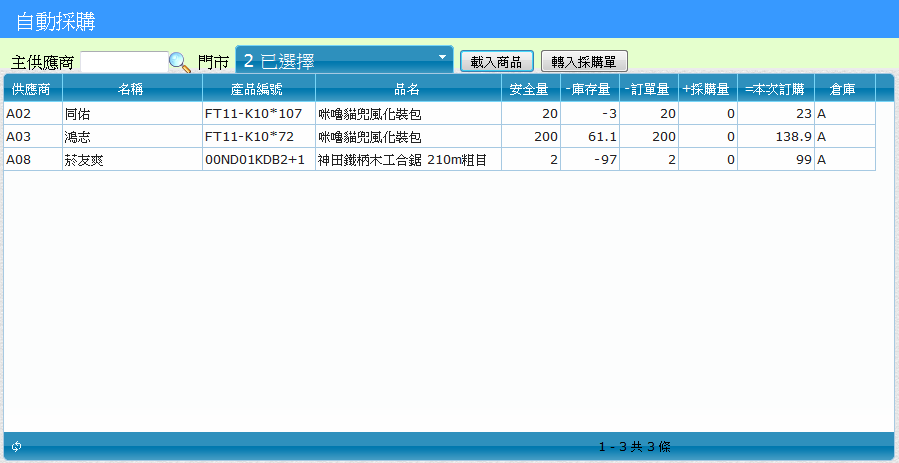 自動採購作業,依據安全存量、訂單未出量、採購未進量計算,依供應商生成不同採購單