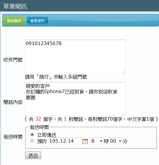 單筆簡訊發送,可自定內容,並選取會員資料即時發送