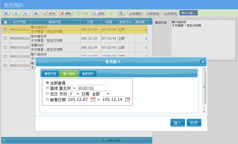 透過不同條件(例:當月生日)整批匯入後,使用樣板簡訊大量發送簡訊